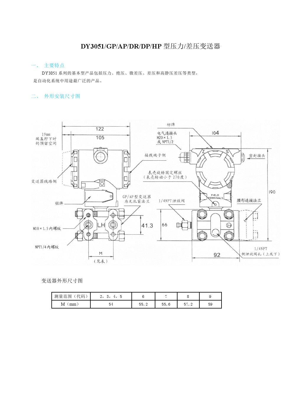 DY3051GP或AP或DR或DP或HP型壓力差壓變送器